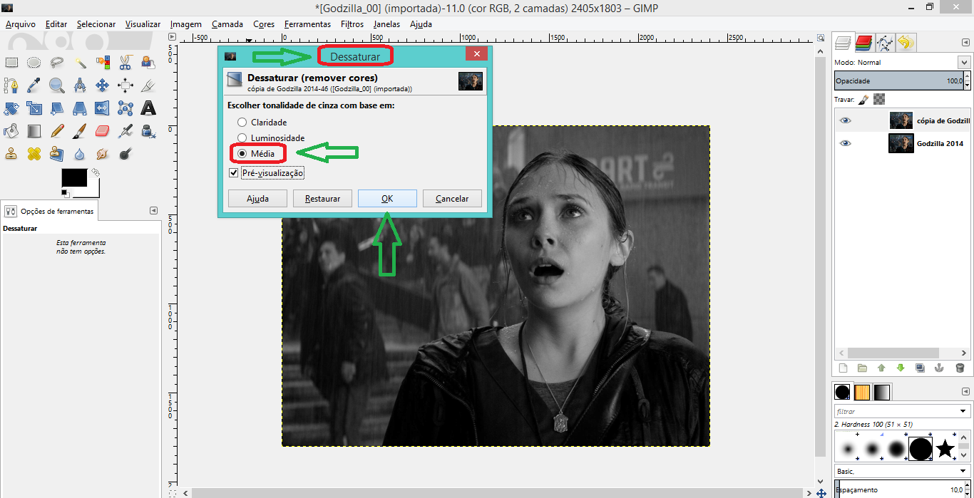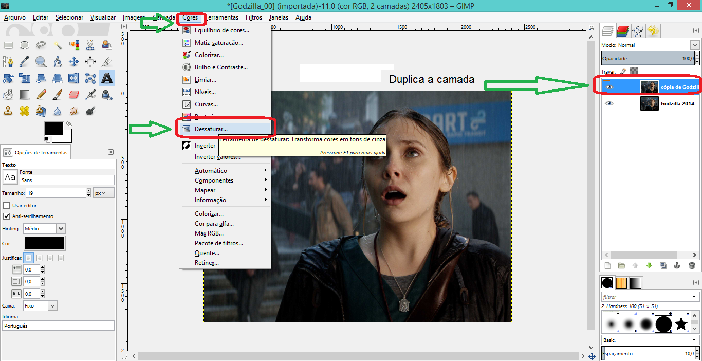 No processo “Duplica a camada”, é o primeiro passo. Clique em Godzilla 2014 e com o botão direito do mouse, selecione “Duplicar camada”. Com a nova cópia, selecione e no menu CORES/Desaturar. Aliás vamos aplicar o efeito de PB (Preto e Branco) na cópia para depois aplicarmos uma máscara nela.