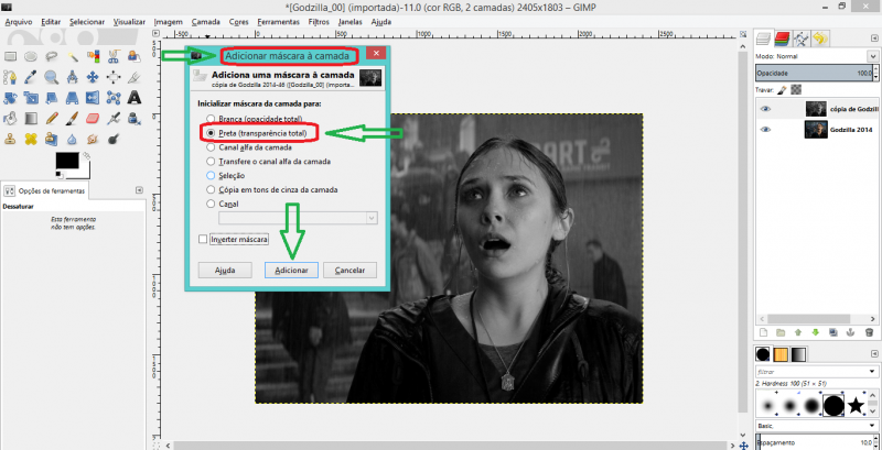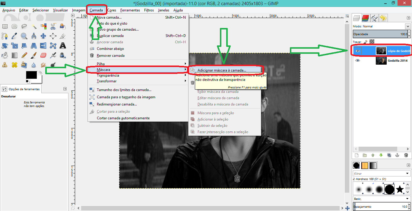 Selecione no MENU CAMADA\Máscara\Adicionar máscara a camada. E lembre-se, continue selecionando a Cópia de Godzilla 2014. Estamos agora colocando uma tela que irá ‘permitir’ que você pinte a parte da imagem que quer que fique preto e branco.
