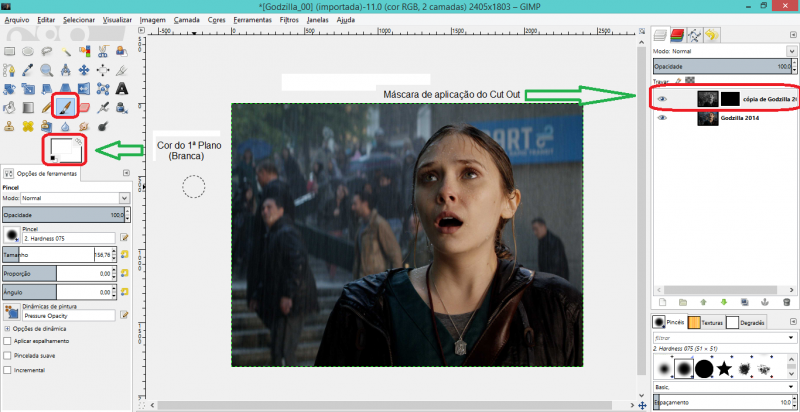 Agora a cópia do Godzilla 2014 está sob o efeito do PB com aplicação da máscara, o qual revela a camada original (colorida). Apenas com o uso pincel, utilizando a saída na cor branca configurada no primeiro plano, teremos o efeito do Cut-out na figura original. Aliás estamos limitando que ela seja, toda, PB.