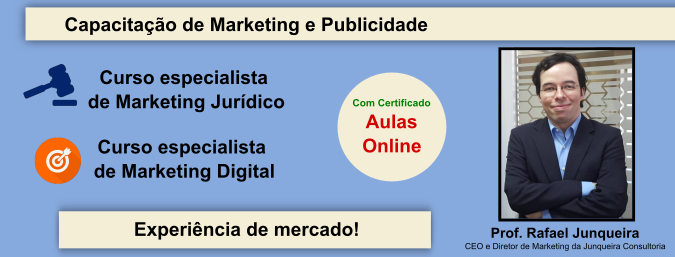 Rafael Junqueira é Professor, CEO e Diretor de Marketing da Junqueira Consultoria. Publicitário e especialista em Marketing Digital e Marketing de Relacionamento. Possui mais de 8 anos em experiência em Marketing Jurídico, autor de mais de 100 artigos. Pós graduado em Adm. de Marketing e Comunicação Empresarial (UVA), Marketing de Relacionamento (IBMEC) e Gestão de Riscos em Marketing Digital (ESPM).