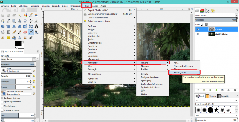 Agora vamos criar de fato a névoa na nova camada que criamos. Clique no menu FILTROS\RENDERIZAR\NUVEM\RUÍDO SÓLIDO.