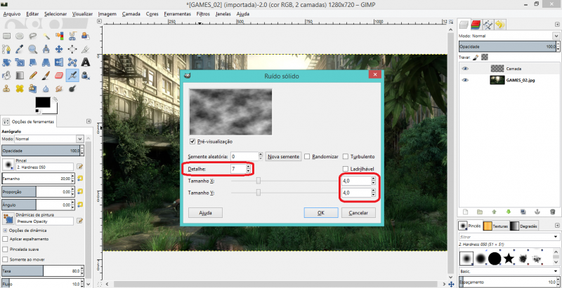 Na janela configure detalhe em 7, e no tamanho X e Y em 4.0. Depois clique em OK.