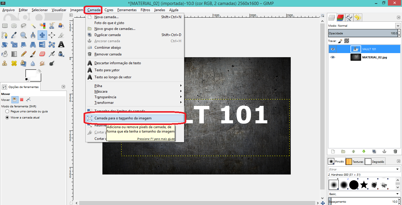 Esse é um recurso novo de camada que não tratamos antes. Ele cria uma camada com o mesmo tamanho da seleção. É uma forma de trabalhar com mais precisão. Então vá no menu CAMADA\CAMADA PARA O TAMANHO DA IMAGEM e lembre-se, selecione a camada do texto ‘Vault 101’.