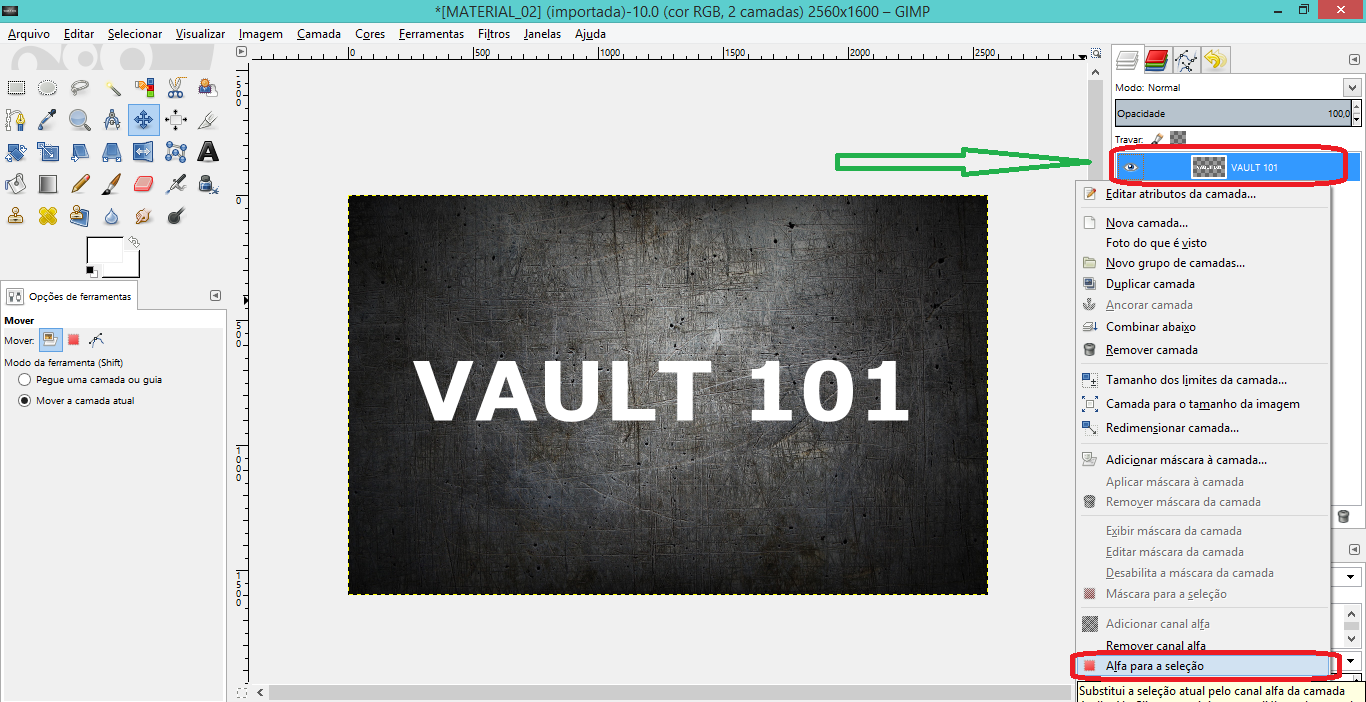 Selecione o com o botão direito do mouse sobre “Vault 101” e selecione “Alpha para seleção”. Vamos nos permitir editar o formato da letra. Esta parte é essencial para ‘enterrar’ a letra na superfície, matéria principal deste tutorial.