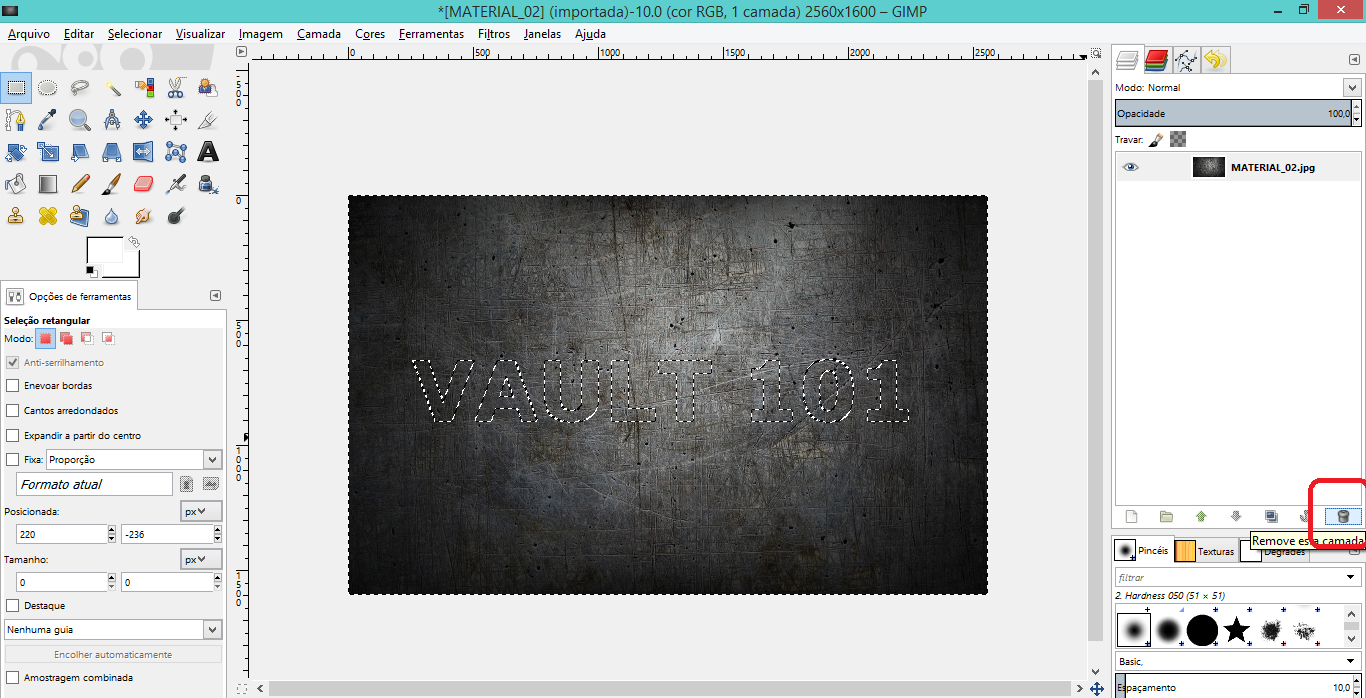 Após aplicar o deslocamento, vamos agora apagar a ‘letra’. Lembra daquela seleção invertida que fizemos lá em cima? Aqui irá valer muito. Portanto clique na lata de lixo ali identificada na figura para apagar o miolo, a letra continua existindo.