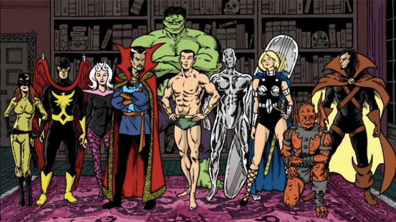 Dr. Estranho, Pantera Negra, Senhor Fantástico, Raio Negro, Namor, Fera e Capitão América.