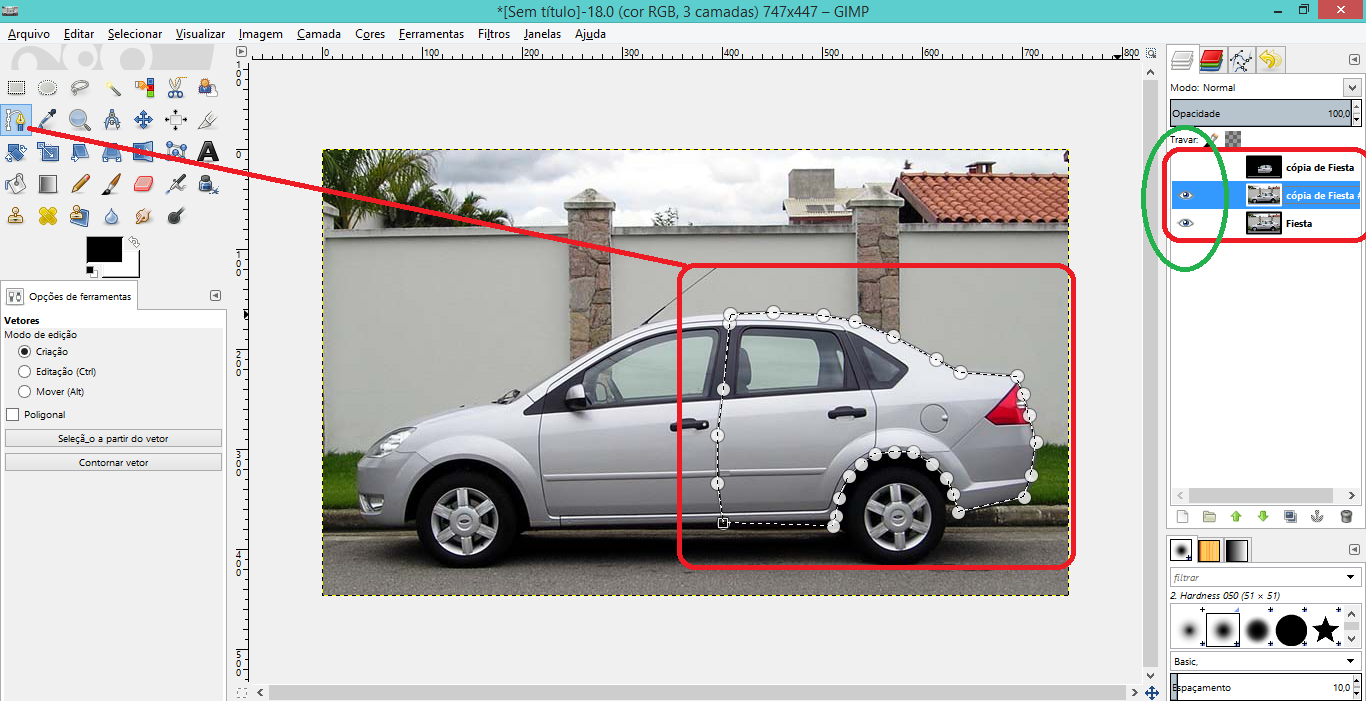 Na terceira parte nós vamos trabalhar com a seleção usando a ferramenta de vetores indicado no painel do lado esquerdo. Este recurso nos permite fazer uma seleção do que queremos a mão livre. Assim vão ‘cortar‘ uma parte da imagem, ideal para que possamos dividi-lo.