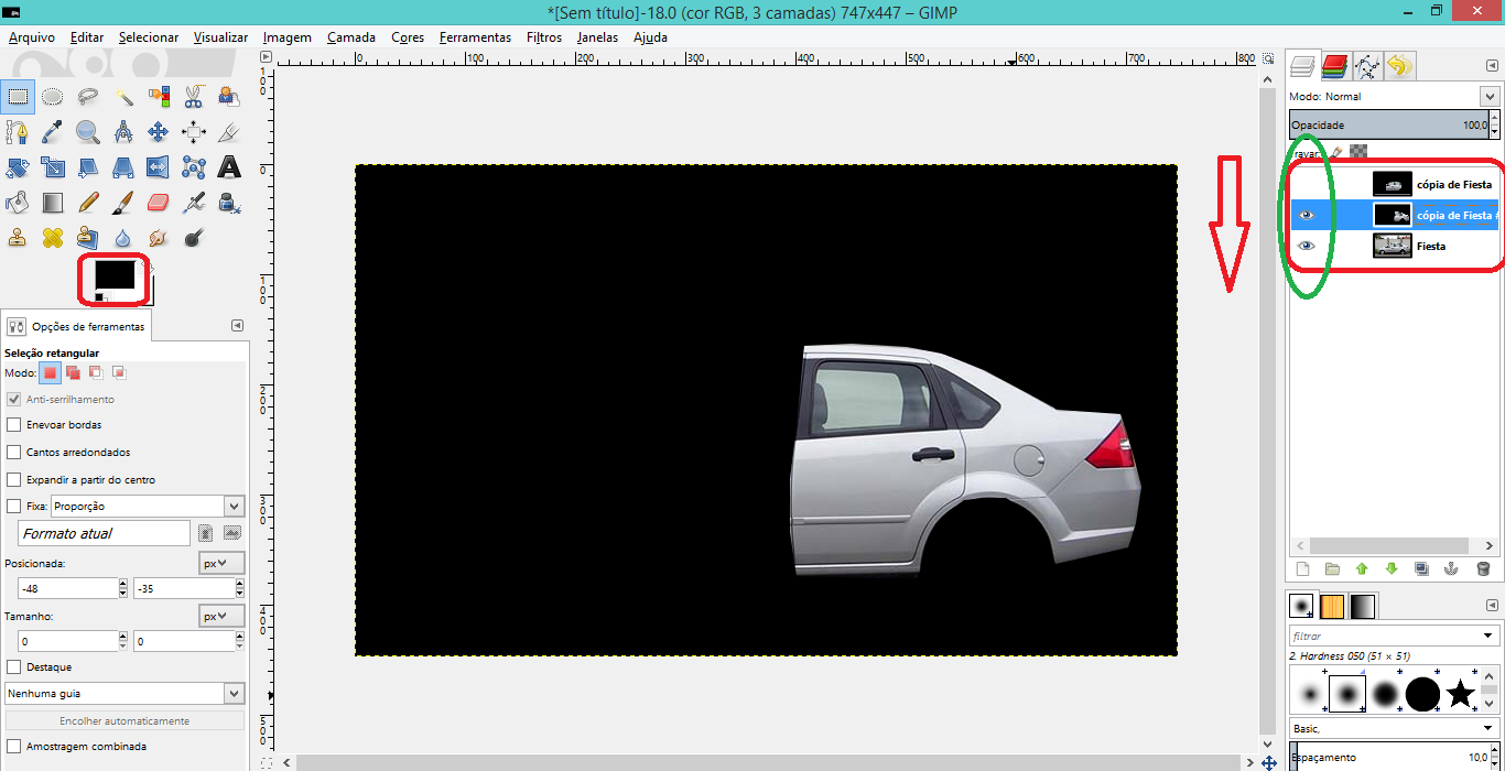Agora nesta parte deve haver atenção. No painel de camadas, você observa que há a camada primária e a cópia da camada. Selecione com o botão do mouse esquerdo a cópia, e todas ações sobre serão efetivas, senão o fizer, não conseguirá trabalhar com ela. O próximo passo vai envolver conhecer alguns atalhos no teclado, é útil quando se trabalha com imagens mais trabalhosas.